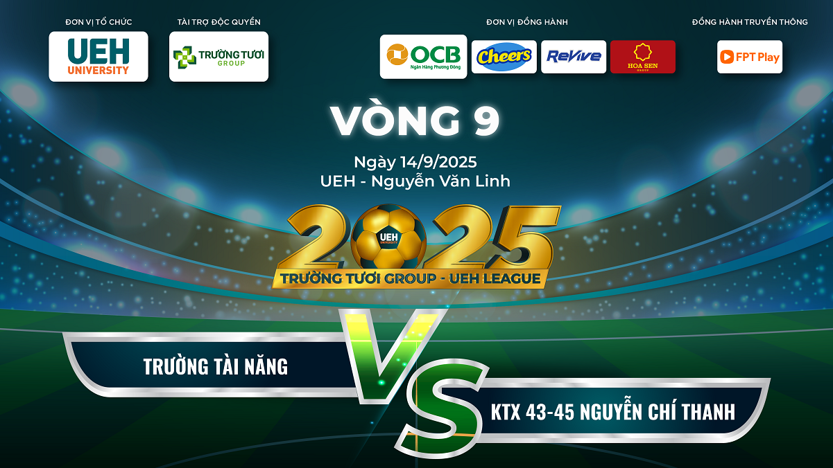 Lúc 17h30 ngày 14/9/2025 trên sân bóng đá UEH Nguyễn Văn Linh sẽ diễn ra trận đấu tâm điểm vòng 9 – cuộc so tài tranh ngôi nhất bảng giữa KTX 43-45 Nguyễn Chí Thanh và Trường Tài năng (UEH.ISB).